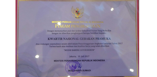 "Dengan ini diberikan penghargaan kepada Kwartir Nasional Gerakan Pramuka atas dukungan sepenuhnya secara aktif dalam Penyelenggaraan Angkutan Lebaran Tahun 2017. Terimakasih atas dedikasi dan kualitas kerja yang telah diberikan," demikian bunyi Piagam Penghargaan Kemenhub untuk Kwarnas. Penghargaan tertanggal 10 Juli 2017 itu ditandatangani Menteri Perhubungan Budi Karya Sumadi.