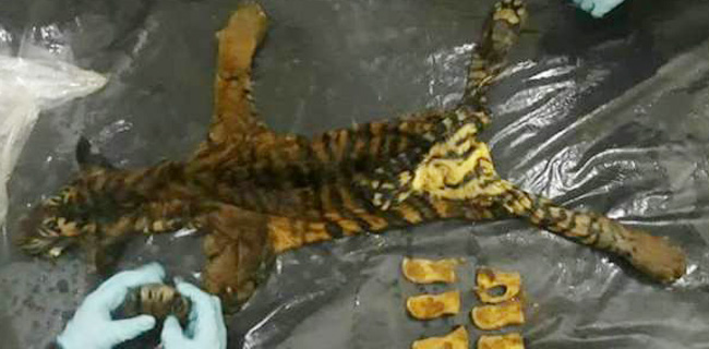 Dari hasil penyergapan diamankan dua orang pelaku atas nama Sunardi dan Rahmad, beserta barang bukti berupa dua lembar kulit harimau yang masih basah dan tulang harimau Sumatera.