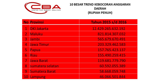 CBA baru-baru ini merilis tentang potensi kebocoran anggaran dari 34 provinsi se-Indonesia, di mana Maluku berada pada urutan kedua, dengan potensi kebocoran sebesar Rp 821.814.307.032. Baca :
