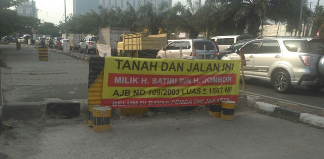 RMOLJakarta.Com, sebuah spanduk menempel di pagar penutup jalan. Pemagaran papan sepertinya dilakukan oleh ahli waris Satiri bin H. Jombor yang protes belum menerima pembayaran lahan dari Pemprov DKI.