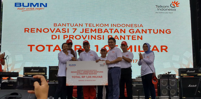 Direktur Utama Telkom Alex J. Sinaga mendampingi Menteri BUMN Rini Soemarno menyerahkan bantuan secara simbolik kepada Ketua DPRD Banten Asep Rahmatullah di sela acara jalan sehat bertajuk BUMN Hadir Untuk Negeri di Alun-alun Kota Serang (Minggu, 13/8).