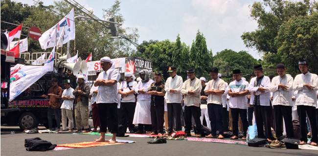 Ratusan massa aksi berbagai ormas Islam menyempatkan diri Salat Dzuhur di depan Kedutaan Besar Myanmar, Jakarta (Rabu, 6/9).