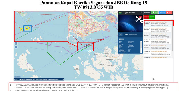 Informasi yang diterima PIM Bakamla RI, tabrakan terjadi pada posisi 01 11.12 LU - 103 49.50 BT. Tabrakan tersebut mengakibatkan kerusakan pada lambung kanan haluan MT Kartika Sagara sedangkan 12 kru MV JBB De Rong 19 jatuh ke laut. 11 di antaranya warga negara Cina dan seorang Warga Negara Malaysia.