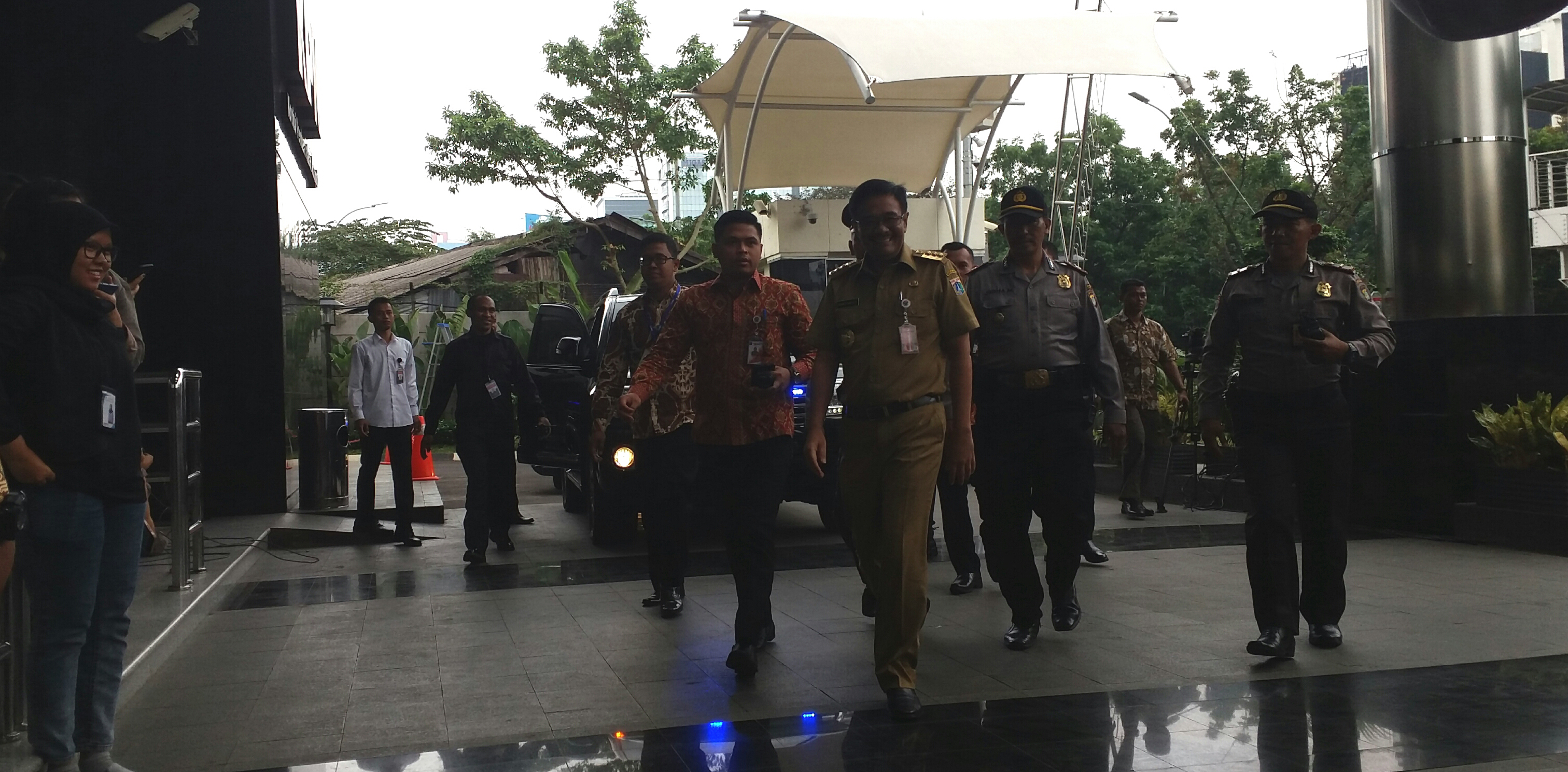 Saat tiba di gedung Agus Rahardjo dkk, Djarot hanya melempar senyum dan melambaikan tangan ke arah wartawan.