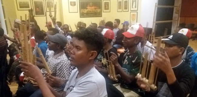 Kahadiran 78 putra putri Papua itu disambut hangat dengan permainan alat musik angklung persembahan Arumba Indonesia Pusaka di aula Jaya Suprana School of Art Performing Mall Of Indonesia, Kelapa Gading, Jumat (6/10) malam.