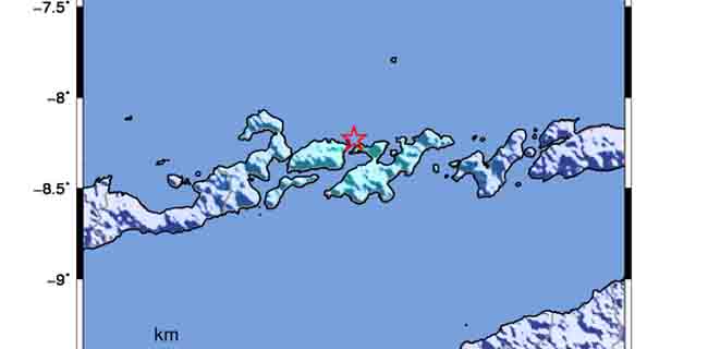 Koordinat titik gempa terletak pada 8,23 derajat lintang selatan (LS) dan 123,37 derajat bujur timur (BT).