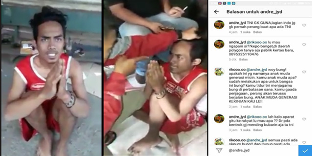 Meski telah meminta maaf, namun pria yang menggunakan jaket merah tetap melayangkan tangan ke arah wajah pria yang diduga menghina TNI. Di akhir video, pria berbaju merah tersebut dibawa ke Korem terdekat.