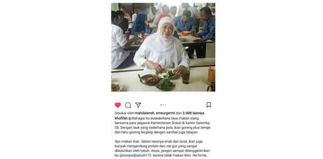 "Bahagia itu sesederhana bisa makan siang bersama para pegawai Kementerian Sosial di kantin Salemba 28. Dengan lauk yang sederhana pula, ikan goreng plus tempe dan tahu goreng lengkap dengan sambal juga lalapan," tulis Khofifah dalam kolom caption foto.