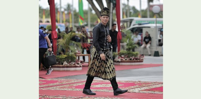 Di jembatan, menggunakan tanjak, selempang hitam bermotif emas, dan batik hitam bermotif melayu, AHY mengakhiri kunjungannya di Bumi Lancang Kuning.