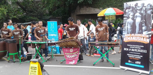 Sekolah Relawan menggalang dana kemanusiaan melalui pagelar musik jalanan di kawasan car free day (CFD), Jalan Jend Sudriman, Jakarta Pusat, Minggu pagi (19/11).