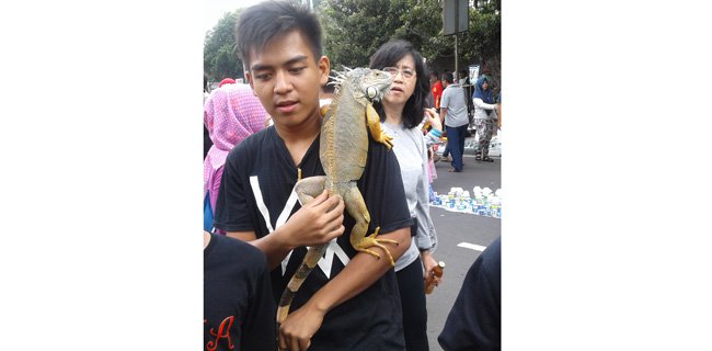 "Selain iguana ada juga ular, ini coba pegang nggak galak kok," tukasnya sambil menyodorkan iguana ke arah orang di sampingnya.