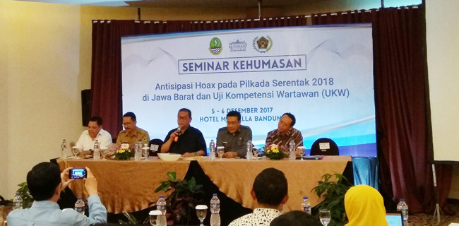 keynote speech kegiatan Seminar Kehumasan bertajuk "Antisipasi Hoax pada Pilkada Serentak 2018 di Jawa Barat' sekaligus Uji Kompetensi Wartawan (UKW) di Hotel Marbella Bandung, Selasa (5/12).
