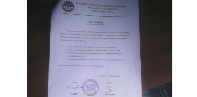 "Waktu demo di Istana kita juga menarik iuran Rp 1 juta per kabupaten, bukan per desa, dan terkumpul Rp 24 juta. Itu pun untuk membiayai kegiatan tersebut. Kalau tidak ada iuran, lalu untuk membiayai kegiatan organisasi darimana?" jelas Mujito yang mengklaim PPDI juga punya SKT dari Kesbangpol Kemendagri No 01-00-00/0039 A/D.III.4/VI/2013 tertanggal 18 Juni 2013.