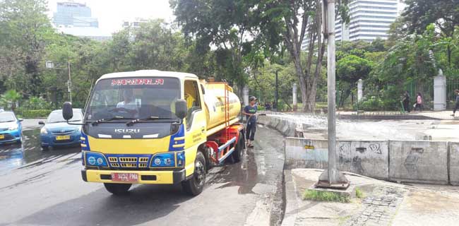 Ada yang berbeda, UPK yang biasanya hanya menyiram tanaman-tanaman di sepanjang kawasan Monas terlihat menyiram bagian bahu jalan.