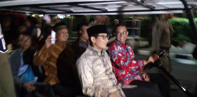 Anies duduk di depan dengan Sandi. Adapin stir mobil dikemudikan oleh Anies. Turut ikut dalam rombongan ini Sekda dan jajaran SKPD Pemprov DKI Jakarta.