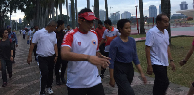 . Wakil Gubernur DKI Jakarta Sandiaga Uno bersama Menteri Badan Usaha Milik Negara (BUMN) Rini Soemarno memulai aktivitas dengan berlari pagi bersama, di Monumen Nasional (Monas), Jakarta, Senin (8/1).