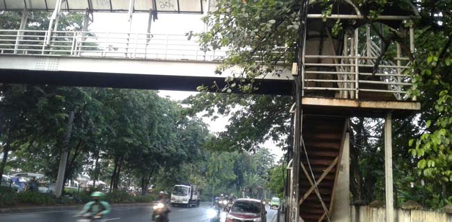Di JPO itu, rangkaian besi bagian atap maupun tiang tangganya sudah terlihat kropos dan rusak.