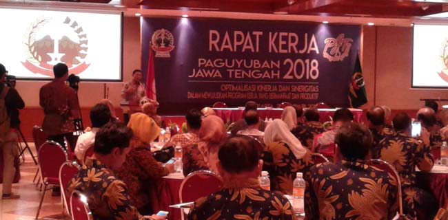 "Dengan ini saya nyatakan Rapat Kerja Paguyuban Jawa Tengah dibuka," ujar Wiranto yang terlihat mengenakan baju batik warna coklat dipadu celana bahan warna hitam.