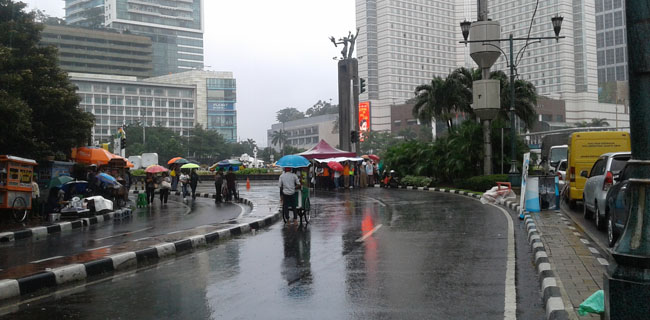 Arena Car Free Day (CFD) di Bundaran Hotel Indonesia, Jakarta Pusat, sepi aktivitas karena diguyur hujan, pagi ini (Minggu, 4/2)