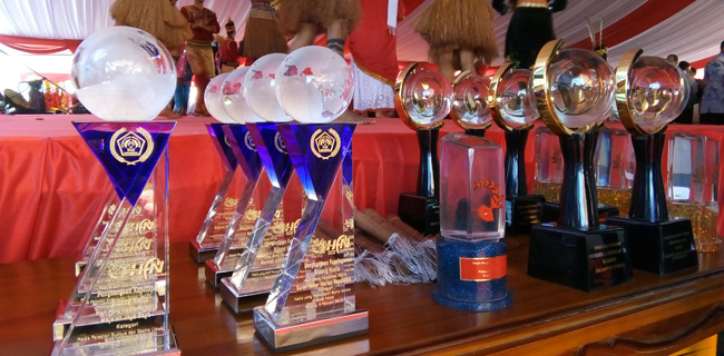 Deretan piala yang akan diberikan kepada insan pers berprestasi sudah dipajang di arena perayaan puncak Hari Pers Nasional 2018 di Danau Cimpago, Pantai Pandang, Sumatera Barat, Jumat (9/1). Piala tersebut terbagi dalam kategori Penghargaan Adinegoro, Penghargaan Kepeloporan Bidang Media, HPN Award, serta Penghargaan Pena Emas untuk orang-orang yang mendediksikan hidupnya menjadi jurnalis. Penyerahan penghargaan akan diberikan di hadapan Presiden Joko Widodo. Ahmad Kiflan Wakik/RMOL