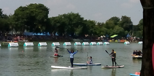 "Pak Sandi berenang tapi Bu Menteri (Susi) naik itu ngedayung (kayak/kano), tapi seru yang begini," ucap seorang ibu yang antusias menjagokan Sandiaga.
