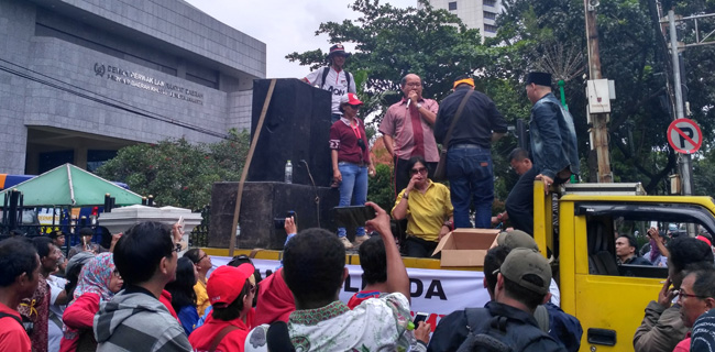 "Walaupun kecewa dengan Gubernur dan Wakil Gubernur DKI Anies-Sandi yang cuek dengan kita, tapi ada anggota DPRD yang mau menemui kita," seru salah satu orator yang disambut tepuk tangan peserta demo.