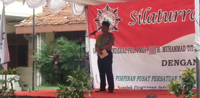 Kapolri berpidato dalam acara silaturahmi dengan Pimpinan Pusat Persatuan Tarbiyah Islamiyah (Perti), di Jalan Tawakal Raya, Jakarta, Sabtu (3/3).