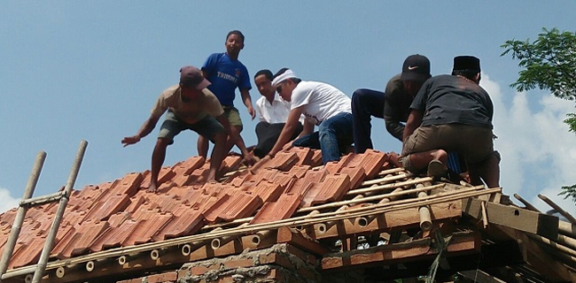 Warga sempat melantunkan salawat melalui pengeras suara saat Demul memasang genting rumah milik guru ngaji tersebut.