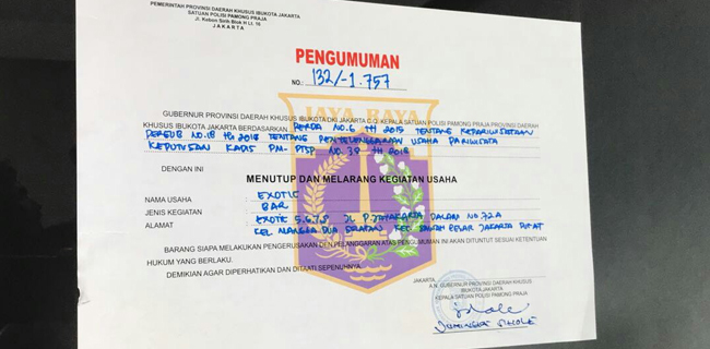 Keputusan ini mengacu surat rekomendasi Dinas Pariwisata dan Kebudayaan (Disparbud) DKI Jakarta tentang pencabutan izin usaha atau Tanda Daftar Usaha Pariwisata (TDUP) PT Agung Wahana Indonesia pemilik merk usaha Sense International Executive Club dan Sense Ballroom & Dining Theatre serta PT Exotic Paradise pemilik merk usaha Exotic.