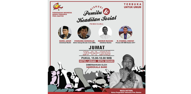 Ketua PI Banten Reiza Patters mengatakan, diskusi akan menghadirkan pembicara tokoh nasional, Ketua Umum PP Pemuda Muhammadiyah Dahnil Anzar Simanjuntak dan Direktur Sabang Merauke Circle (SMC) Syahganda Nainggolan.