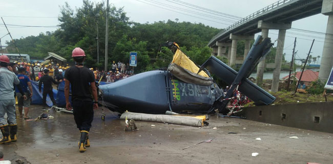 Tampak pada foto yang disertakan, posisi heli jatuh di pinggir jalan, dekat sebuah jembatan