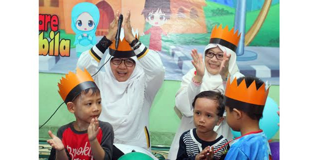 Ketua Bidang Perempuan dan Ketahanan Keluarga (BPKK) DPP Partai Keadilan Sejahtera (PKS) Wirianingsih bercengkrama dengan anak asuh di Tempat Penitipan Anak Rumah Keluarga Indonesia (TPA RKI), Jakarta Utara, Minggu (22/4). Terdapat sekitar 20 anak buruh perempuan yang menitipkan anaknya di TPA RKI sehari-hari secara gratis.