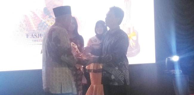 Sebelum naik ke atas panggung menerima piala, pegiat kemanusiaan yang sudah berusia 76 tahun itu sempat berjabat tangan dengan CEO RMOL Group, Teguh Santosa.