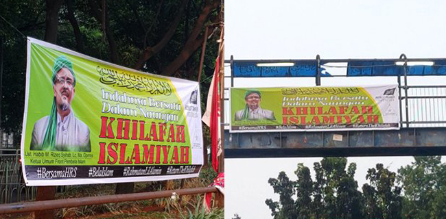 Spanduk HRS "Indahnya Bersatu Dalam Naungan Khilafah Islamiyah" yang bersanding dengan bendera Hizbut Tahrir Indonesia (HTI) terpasang beberapa titik di Jabodetabek.