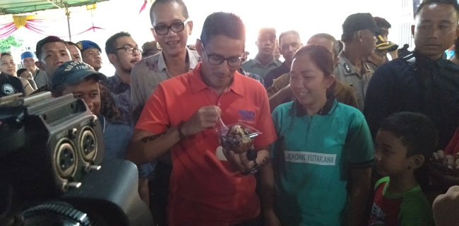 Saat mengunjungi Tumpah Ruah, Sandi yang diikuti oleh beberapa pengawalnya mencoba berbagai makanan, minuman dan kain yang dijual di Gudang bekas bangunan pendukung mall Sarinah itu.