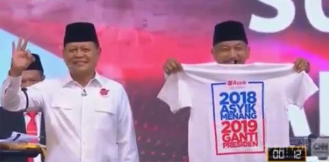 Pernyataan Sudrajat dilengkapi aksi pasangannya, Ahmad Syaikhu, pamer kaos putih bertuliskan "2018 Asyik Menang, 2019 Ganti Presiden".