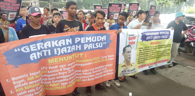 Koordinator Aksi Ahmad Faisal mengatakan, ratusan massa aksi yang memadati halaman depan KPU Pusat menyampaikan aspirasi dan tuntutan. Diantara poin yang disampaikan yaitu, KPU harus mendiskualifikasi Jaro Ade yang berpasangan dengan Ingrid Kansil dari perhelatan Pilkada Kabupaten Bogor karena menggunakan ijazah palsu.