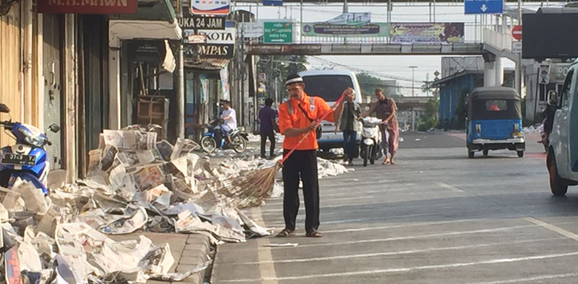 Sampah koran tampak berserakan di Jalan Matraman, Kecamatan Jatinegara, Jakarta Timur, dekat Monumen Perjuangan, Jumat pagi (15/6).