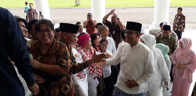 Mendadak serambi istana bogor dipenuhi teriakan huuuu. Ratusan orang yang sedang mengantri itu kompak meneriaki Anies - Sandi yang sedang berjalan bersama istri menuju tangga Istana untuk berlebaran dengan Presiden Jokowi.