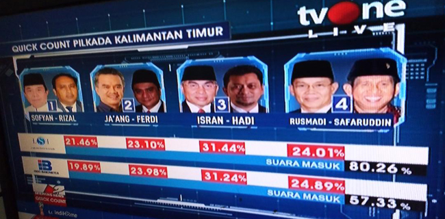 . Hasil hitung cepat atau quick count Pilgub Kalimantan Timur 2018 menempatkan paslon Isran Noor-Hadi Mulyadi di urutan pertama. < SEBELUMNYA