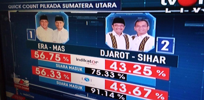 . Hasil hitung cepat (quick count) Pilgub Sumatera Utara 2018 menempatkan pasangan calon Edy Rahmayadi-Musa Rajekshah (Eramas) mengungguli pesaingnya Djarot Saiful Hidayat-Sihar Sitorus (Djoss). < SEBELUMNYA