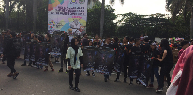Cut Meyrizka beserta iring-iringan kuda lumping yang melintas di Jalan MH Thamrin hingga ke Bundaran HI dikerumuni oleh pengunjung yang mengajak foto bersama dengan artis muda asal Aceh tersebut.