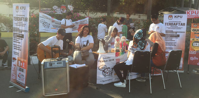 "Ayo Bapak Ibu semuanya silakan dicek apakah anda sudah terdaftar atau belum di Pemilu 2019 ini," ajak Panitia Pemungutan Suara Tingkat Kelurahan, Asri Ifah di antara kerumunan pengunjung car free day.