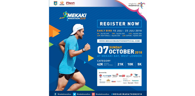 Registrasi Mekaki Marathon 2018 untuk publik alias peserta umum sudah dapat dilakukan secara online melalui situs Mekaki Marathon (mekakimarathonofficial.com) mulai hari ini. Promo Early Bird akan diberlakukan mulai 10 sampai 23 Juli 2018. Setelah tanggal tersebut akan diberlakukan harga normal hingga tanggal 31 September 2018 atau setelah quota tiket habis.