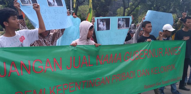 Koordinator Aksi, Muamar Khadafi menjelaskan bahwa mereka datang untuk menuntut agar Gubernur dan Wakil Gubernur Anies Rasyid Baswedan dan Sandiaga Salahuddin Uno segera mendepak para oknum relawan yang kerap kali menjual nama mereka.