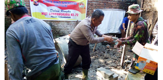 Polsek Pangandaran Polres Ciamis bersinergi dengan Koramil Pangandaran merenovasi rumah Lukmanul Hakim di Dusun Sukamanah, Desa Purbahayu, Kecamatan Pangandaran, Ciamis, Jawa Barat, Rabu (11/07).