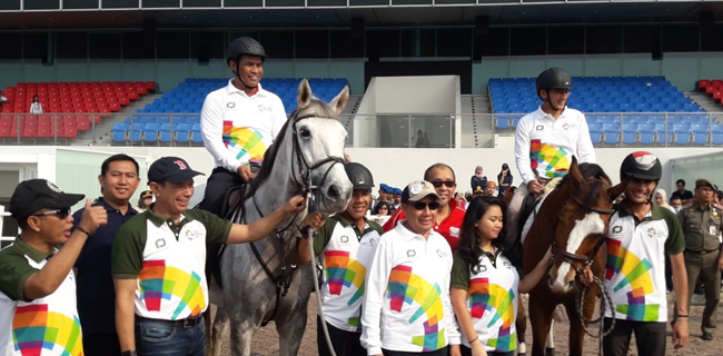 Sandi pun mengelilingi venue Equastrian dengan berkuda yang didampingi pendamping. Namun ada yang aneh, Mentan Amran tak ikut mengelilingi venue dengan kuda lantaran takut.