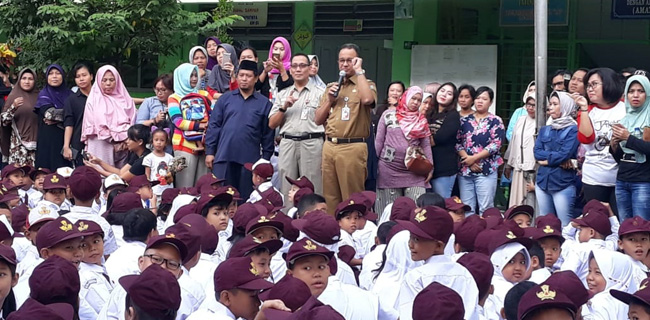 Gubernur DKI Jakarta Anies Baswedan didampingi Walikota Jakarta Timur M. Anwar dan Plt Kepala Dinas Pendidikan DKI Jakarta Bowo Irianto mengunjungi SDN Kampung Melayu 01-02, Jatinegara, Jakarta Timur.