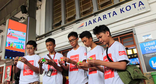 Puluhan peserta dari komunitas rubik se-Jabodetabek mengikuti lomba rubik di atas KRL, Stasiun Jakarta Kota, Jakarta, Minggu (29/7).