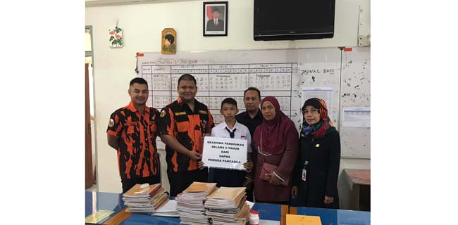 Ketua Bidang Politik Sapma Pemuda Pancasila Indra Triaputra menyerahkan langsung beasiswa kepada Adriansyah untuk pendidikannya selama enam tahun ke depan.